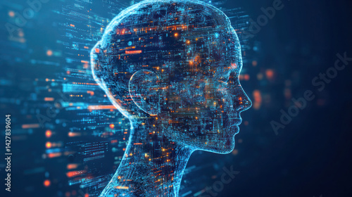 The watermark will not be included on Poster.: Human head with digital binary code and gears concept illustration