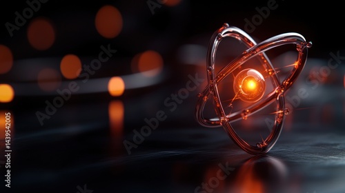 The watermark will not be included on Poster.: Illuminated atom model on dark surface with bokeh background
