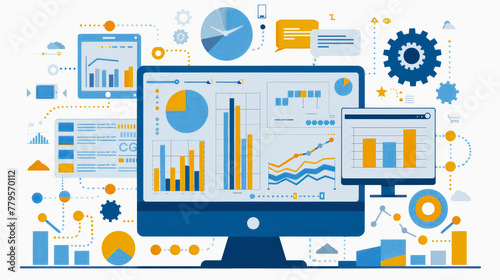 The watermark will not be included on Poster.: Illustration of a computer screen displaying various charts and graphs, surrounded by business icons