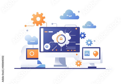 The watermark will not be included on Poster.: Illustration of an ai software platform with computers, gears, and clouds on a white background -