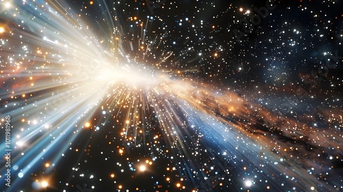 The watermark will not be included on Poster.: Interstellar communication concept with crisscrossing light beams in galaxy representing data flow