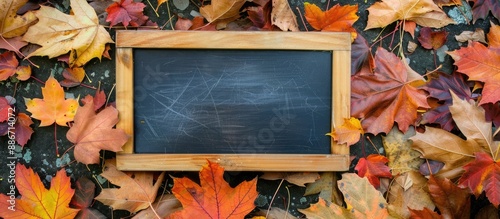 The watermark will not be included on Poster.: Isolated on a white backdrop an empty square school board stands surrounded by vibrant autumn maple