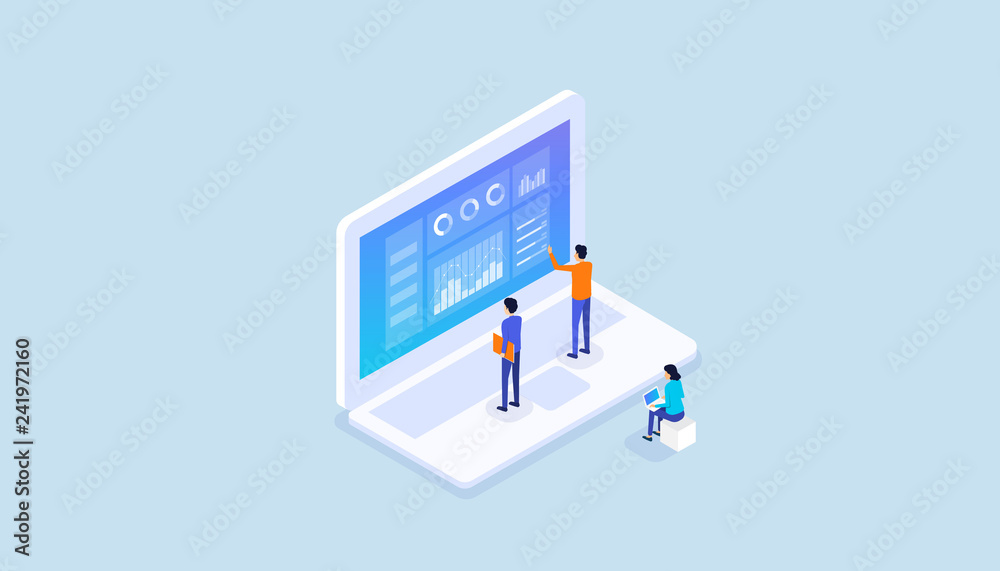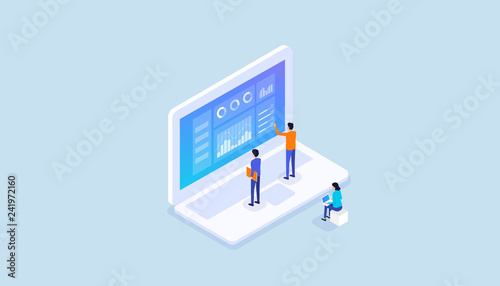 Poster isometric business team analyst report graph on laptop monitor concept monitor and business team wor