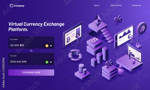 The watermark will not be included on Poster.: Isometric design of virtual currency exchange platform with 3d illustration of working people execut