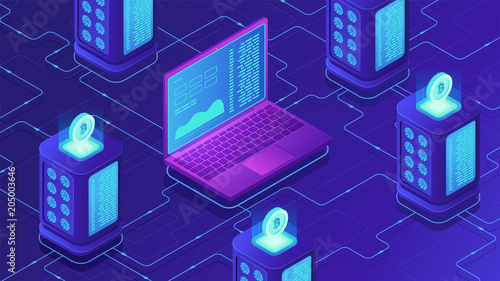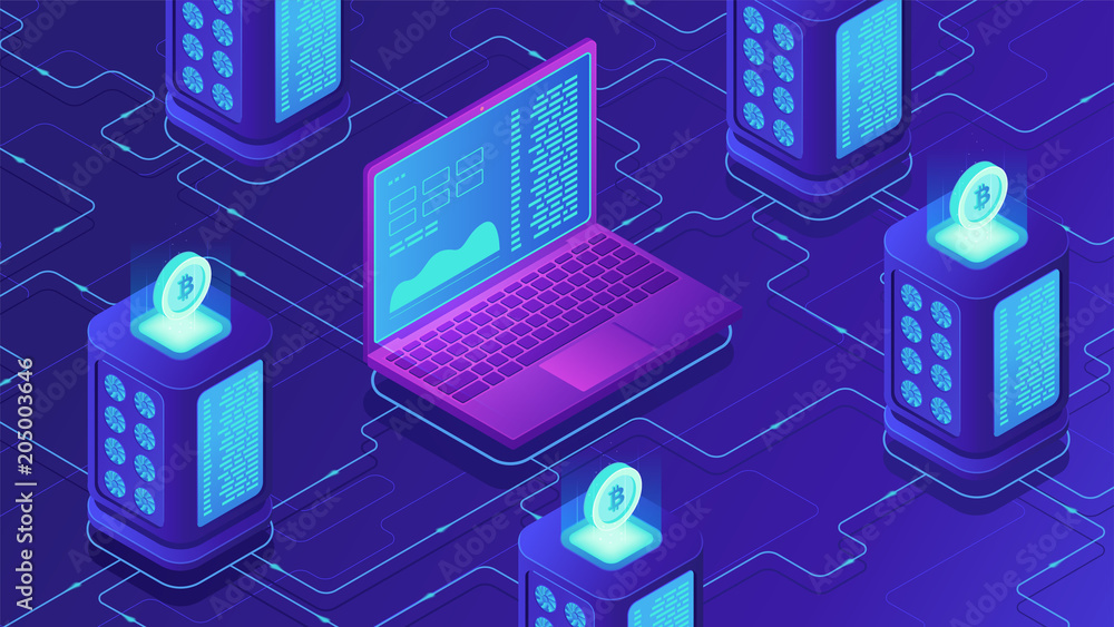 The watermark will not be included on Poster.: Isometric mining farm concept - bitcoin mining farm, cryptocurrency mining concept - blockchain server