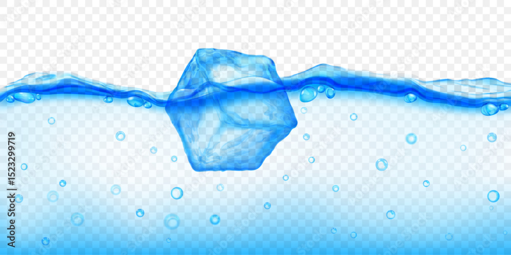 The watermark will not be included on Poster.: Large translucent blue ice cube floating in water with air bubbles, isolated on transparent backgrou