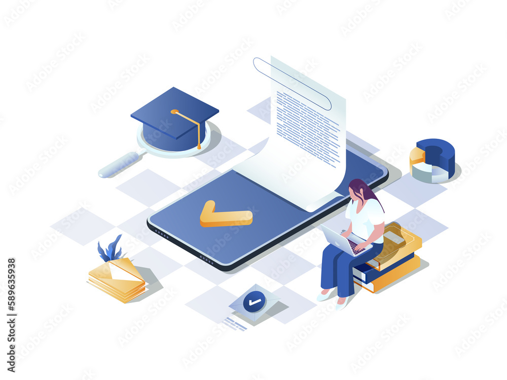 The watermark will not be included on Poster.: Learning management system concept 3d isometric web scene - people studying at online courses platfor