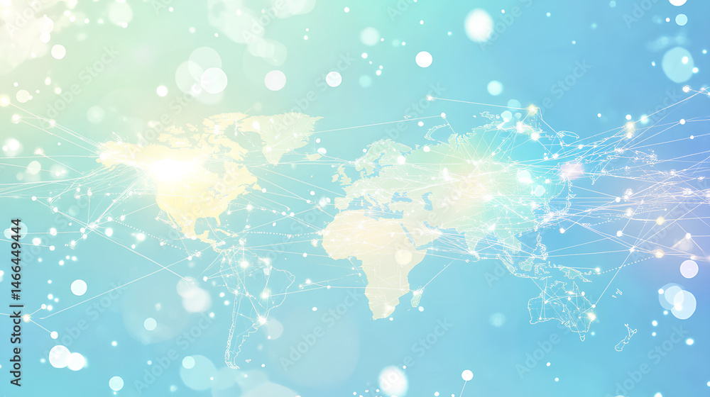 The watermark will not be included on Poster.: Light blue background with a digital world map and global network connections, representing the conc