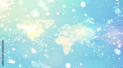 Poster light blue background with a digital world map and global network connections, representing the conc