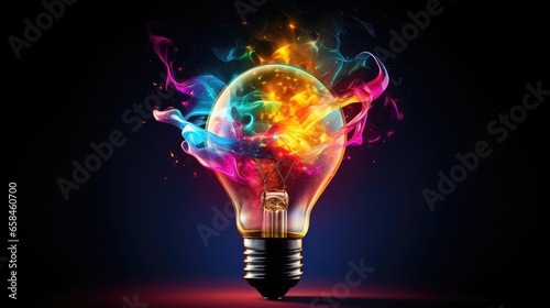 Poster lightbulb idea concept with colorful liquidof splashing unique creative idea on black background, ge