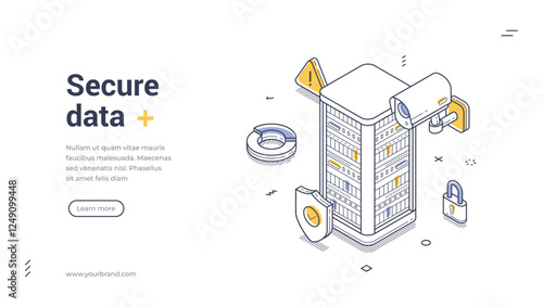 The watermark will not be included on Poster.: Line art shows a secure data center with surveillance cameras and locks - security measures to protec