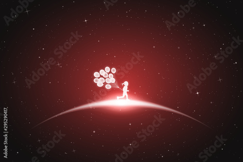 Poster little girl with balloons in space. vector conceptual illustration with white silhouettes of running