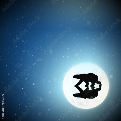 Poster lonely polar bear walking on frozen lake on moonlight night. arctic landscape with animal reflected