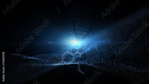 Poster looped dark wavy space with dna chain and hexagon molecules animation.