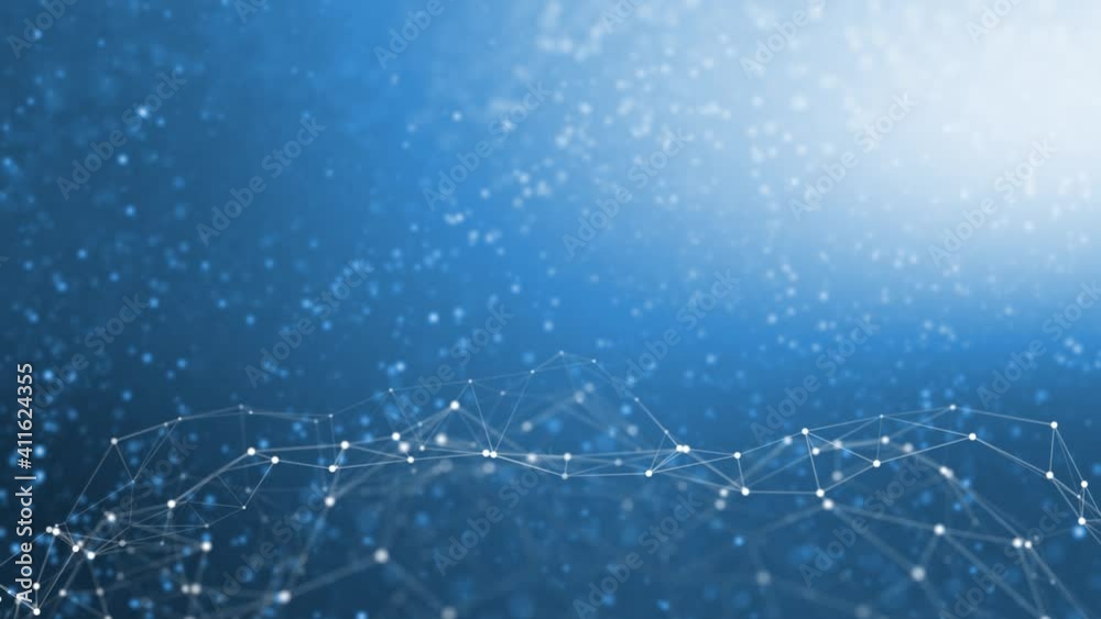 Poster looping features animated technology based shapes, connected white lines and blurry flickering dots