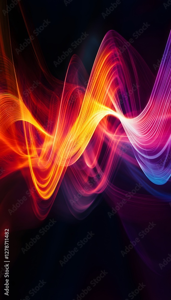 The watermark will not be included on Poster.: Luminous flowing waves move across a dark abstract background