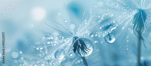 Poster macro image of water droplets on a dandelion seed with a soft blue background provides a circular ab