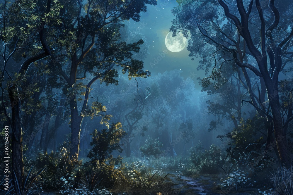 Magical moonlight illuminates a path through a misty forest at night, creating a serene and enchantiPoster
