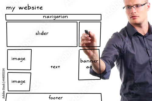 The watermark will not be included on Poster.: Man drawing website wireframe on the whiteboard