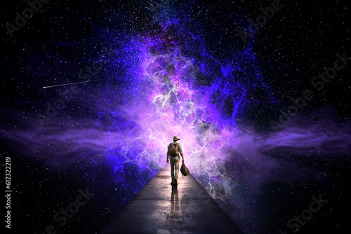 Poster man in front of the universe. ai generative