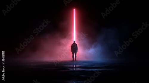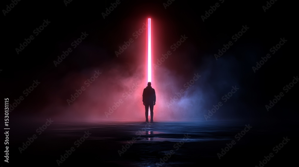 The watermark will not be included on Poster.: Man stands in front of a glowing red light - the image has a futuristic and mysterious vibe, with the