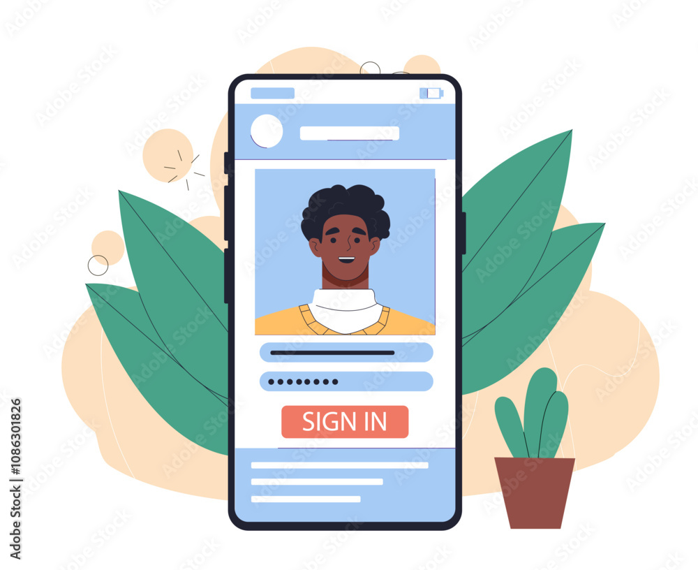 Poster man with account registration. young guy enters his username and password on smartphone screen. prof