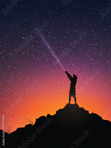 Poster man with flashlight on rock. hiking at night. light beam in starry sky