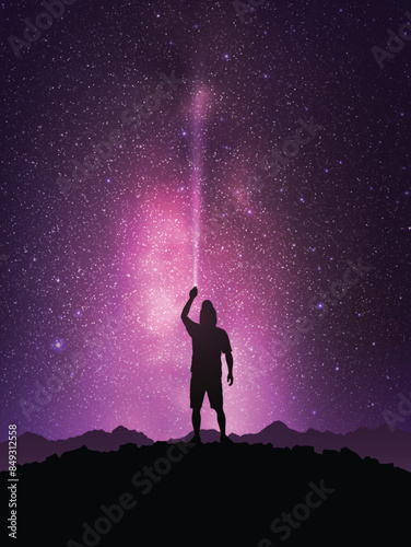 Poster man with flashlight on rock. hiking at night. milky way in starry sky