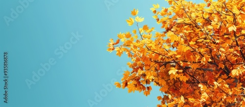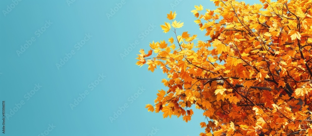 The watermark will not be included on Poster.: Maple tree with yellow leaves set against a clear blue sky - copy space image - place for adding text