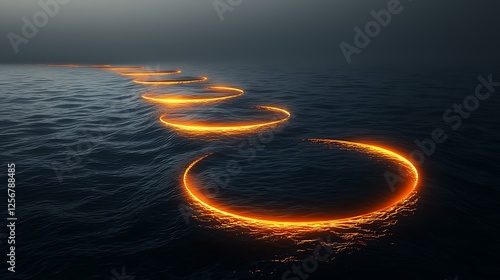 The watermark will not be included on Poster.: Marine crawl pattern glowing circular patterns on dark water under mysterious foggy atmosphere at tw