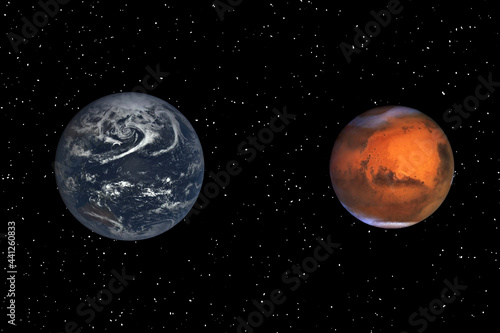 Poster mars and earth. distance between them. space for text. the elements of this image furnished by nasa.