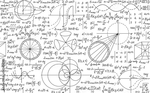 Poster mathematical vector seamless background with handwritten algebra and geometry formulas on a white pa - Posters Poster mathematical vector seamless background with handwritten algebra and geometry formulas on a white pa - Posters