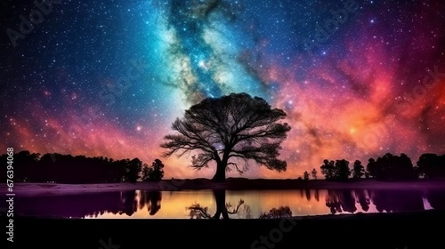 Poster milky way over a lake with a tree and reflection in it. tree on the background of the starry sky and
