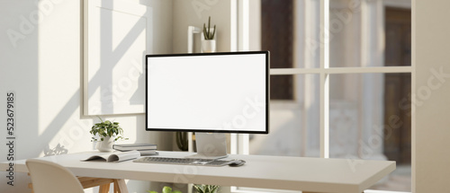 Poster : Minimal white office workspace interior with computer mockup and decors on table against the window