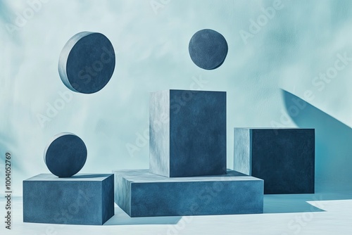 The watermark will not be included on Poster.: Minimalistic abstract scene with geometric shapes in blue tones, featuring floating circles and bloc