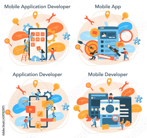 The watermark will not be included on Poster.: Mobile app development concept set - modern technology and smartphone interface