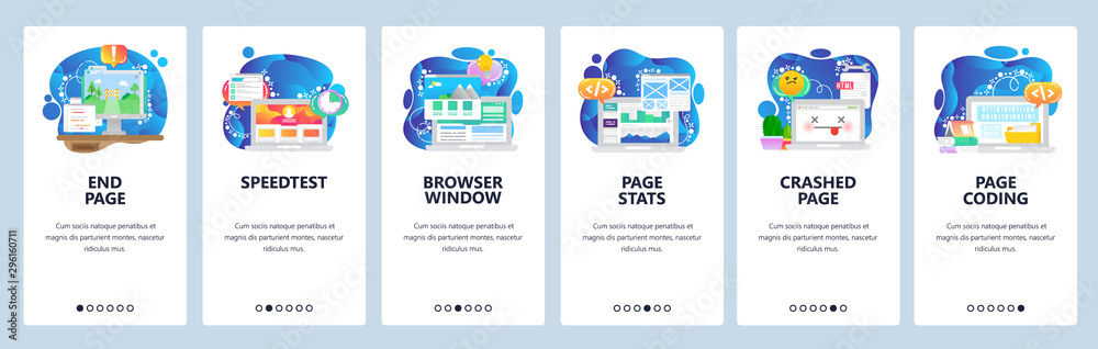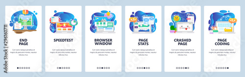 Poster mobile app onboarding screens. web development, coding, traffic monitoring, speedtest. menu vector b