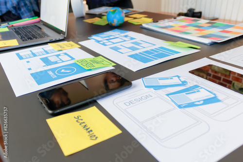 Mobile application development team is studying and designing ux ui system to display and color in aPoster