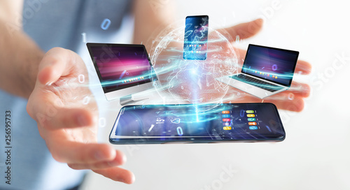 Poster : Modern devices connected in businessman hand 3d rendering