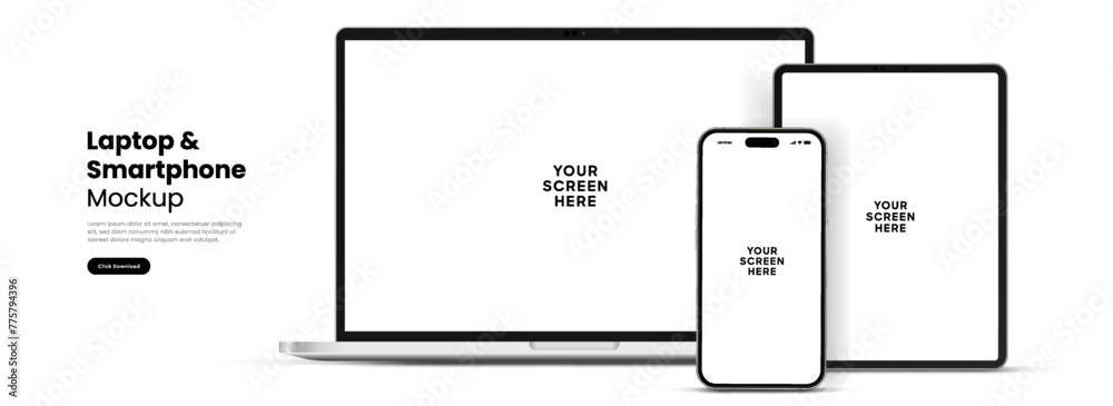Poster : Modern laptop mockup front view and high quality smartphone and tablet mockup isolated on white back