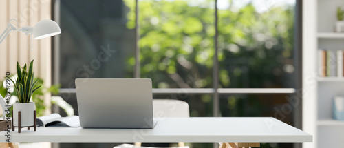 The watermark will not be included on Poster.: Modern stylish workspace with laptop and copy space on the table over blurred office background -