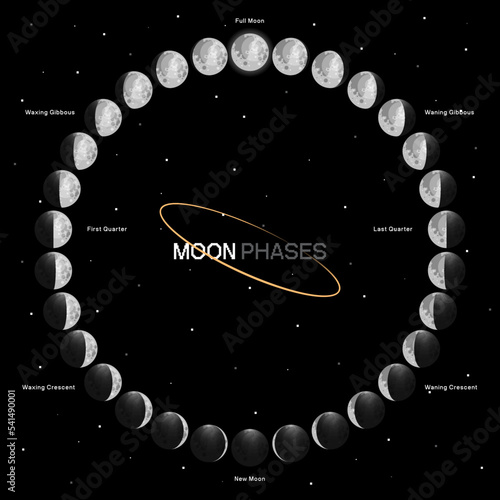 The watermark will not be included on Poster.: Moon phases scheme sphere shadow cycle astronomy icon set - vector illustration background