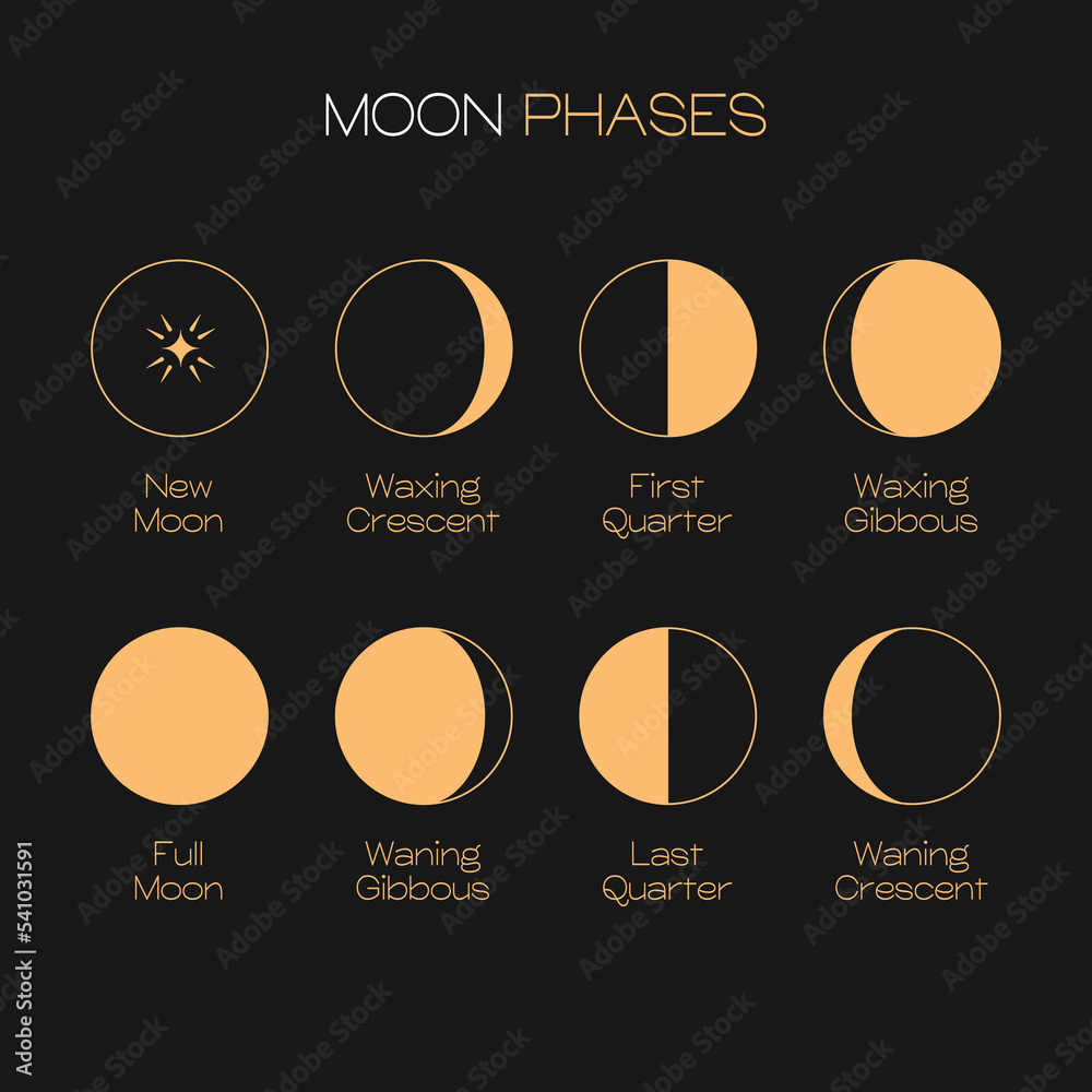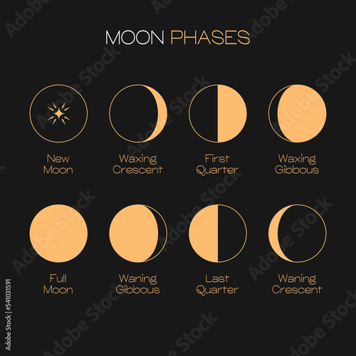 The watermark will not be included on Poster.: Moon phases scheme sphere shadow cycle astronomy icon set - vector illustration background