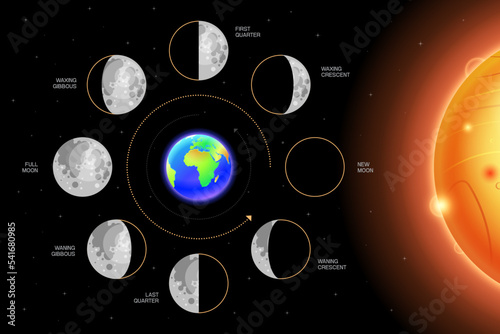 The watermark will not be included on Poster.: Moon phases scheme sphere shadow cycle astronomy icon set - vector illustration background