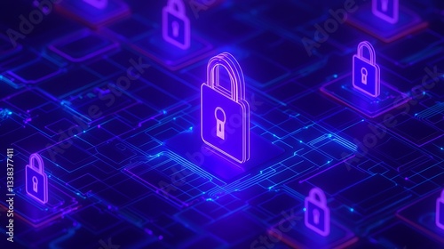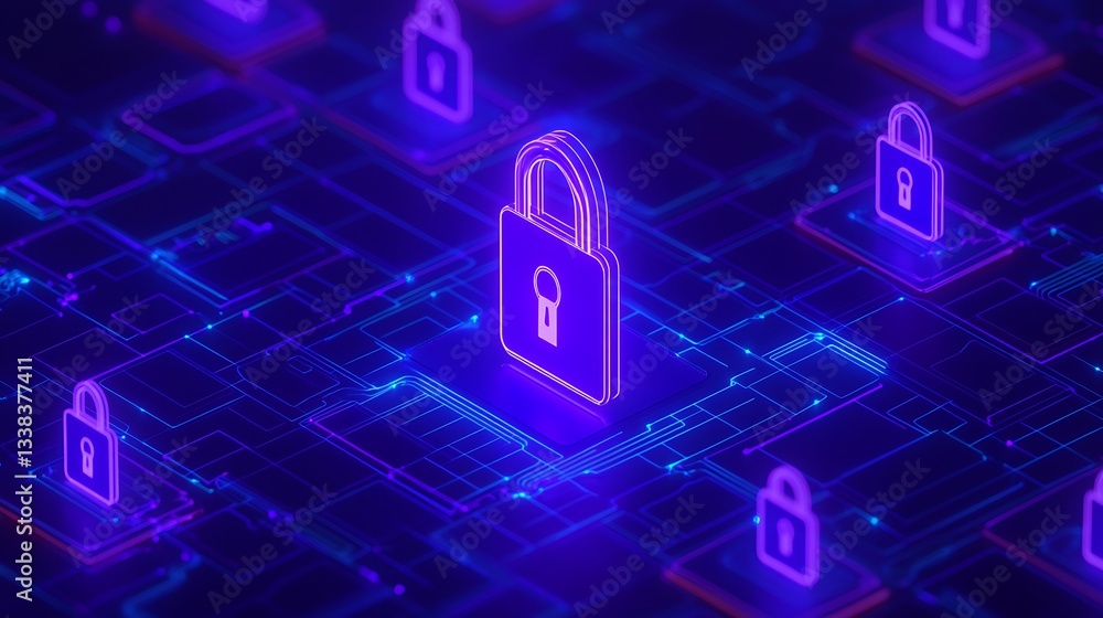 The watermark will not be included on Poster.: Neon digital locks with circuit board background for cyber security and data protection concepts