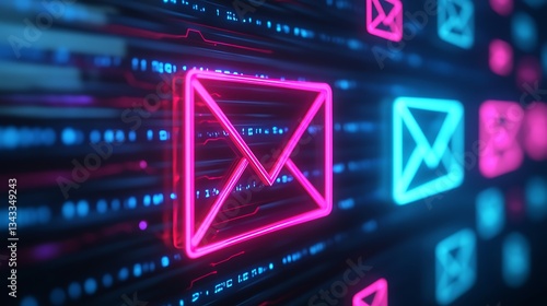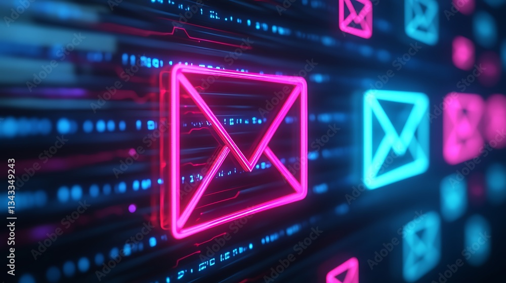 The watermark will not be included on Poster.: Neon envelope icons on a digital background representing electronic communication and messaging tech