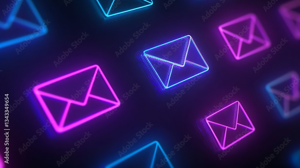 The watermark will not be included on Poster.: Neon glow email icons in abstract digital background for communication and technology themes