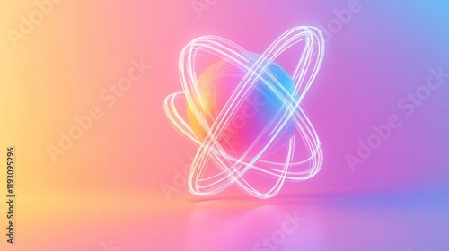 Poster : Neon light swirling around colorful sphere creating a futuristic atom model on gradient background