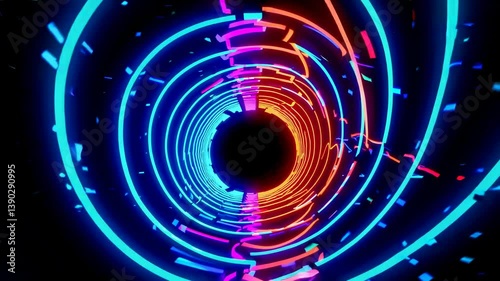 Poster neon lights are swirling around, creating a vibrant tunnel effect with colorful particles exploding