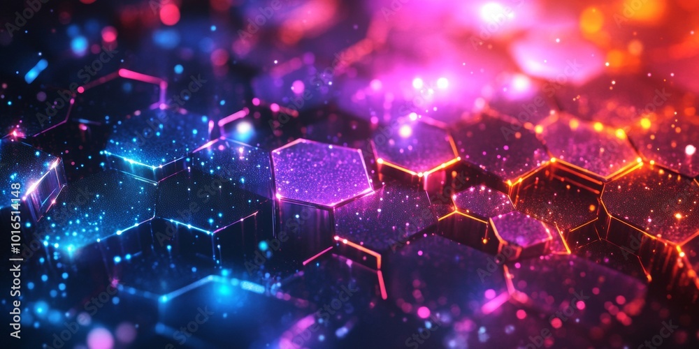 Poster : Neon mosaic fusion, a dynamic arrangement of colorful hexagons and polygons against a glowing backdr